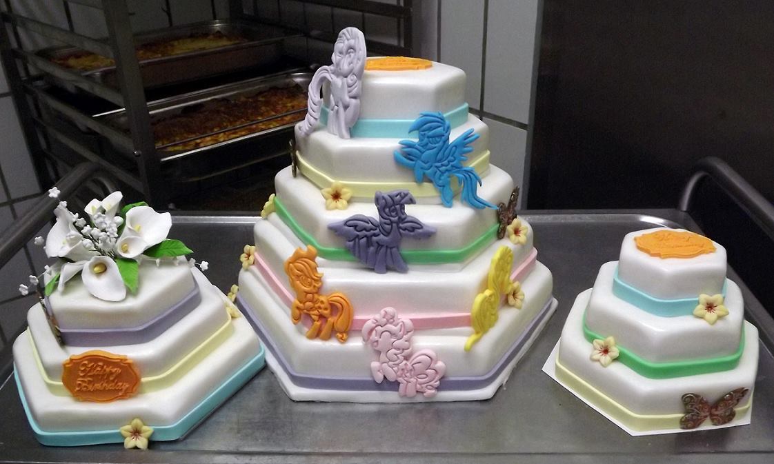 Warum nicht eine klassisch runde Torte? Warum eine eckige? Ganz einfach: Klassisch ist zwar schön, aber ich wollte etwas besonderes machen. Also wurde die Torte eckig – sechseckig, in Anlehnung an die sechs Hauptcharaktere der Serie, aufgrund derer die GalaCon überhaupt erst existiert. Für die oberen Etagen habe ich runde Kuchen gebacken und diese dann passend auf die späteren Unterlagen zugeschnitten. Für die unteren Etagen hatte ich bereits passende Backformen. Wen die Größen interessieren: Die Durchmesser der einzelnen Etagen der Haupttorte waren 13cm, 18cm, 24cm, 30cm und 35cm. Die Unterlagen habe ich per Hand aus einer 3mm dicken Hartschaumplatte zugeschnitten. Für die Zuckerponies habe ich im Vorfeld Ausstecher via 3D Druck anfertigen lassen. Die Torten bestanden aus hellem Biskuit mit einer Füllung aus weißer Schokobuttercreme und Erdbeerkonfitüre, dekoriert mit handgefärbtem Fondant, Zucker- und Schokoblumen (gekauft) sowie Schokoschmetterlingen (ebenfalls gekauft).